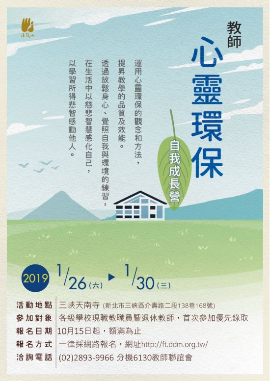 一、研習目的:秉持創辦人聖嚴法師關心教育的精神,以心靈環保的理念和方法,培養學生品德素養,提昇教師教學效能,協助學校順利推動教育工作,舉辦本次成長營。