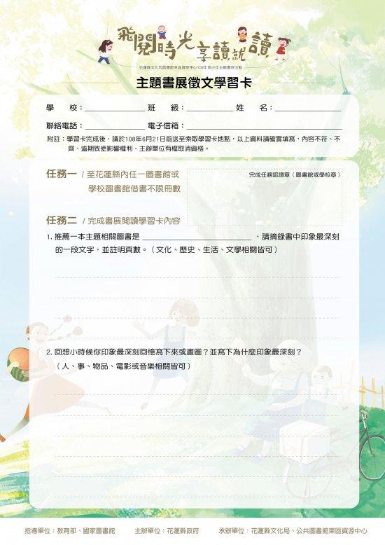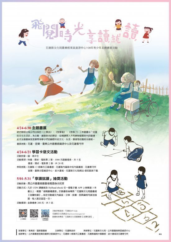一、上揭「飛閱時光 享讀就讀」活動內容如下: (一)主題書展:活動日期自 108 年 4 月 24 日至 6 月 30 日分別於文化局圖書館 1 樓東區資源中心、 13 鄉鎮市立圖書館、參展學校、花蓮看守所及公共圖書館宜蘭、臺東分區資源中心等據點展出。 (二)徵文比賽:活動日期自 108 年 4 月 24 日至 6 月 21 日止;徵文學習卡索取地點為文化局圖書館、 13 鄉鎮市立圖書館、縣內國高中校內圖書館、宜蘭、臺東分區資源中心、政大書城或至花蓮縣文化局網站-便民服務下載等。(三)「享讀就讀」抽獎活動:活動日期 108 年 5 月 1 日至 5 月 31 日,於電子書 APP 上借閱達 3 本書,並在臉書粉絲專頁「花蓮縣文化局圖書館【洄瀾悅讀】」完成指定任務,即具資格可參加抽獎。。 |