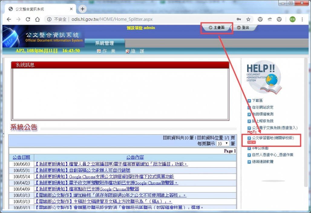 線上學習平台位於主畫面右方「公文學習園地(機關學校版)」(如附件圖)