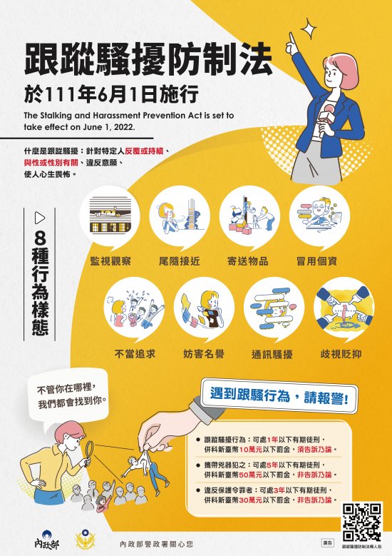 | 主旨: | 檢送內政部警政署「跟蹤騷擾防制法宣導海報」電子檔 1 份(如附件),請貴校廣為宣傳運用,請查照。 |