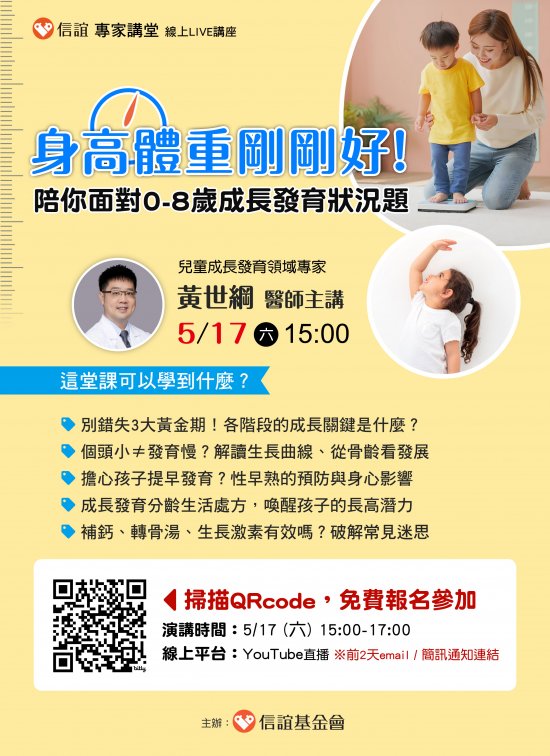 主旨: 信誼基金會於5/17(六)舉辦【黃世綱醫師主講/身高體重剛剛好!陪你面對0-8歲成長發育狀況題】親職講座,敬請轉知貴校家長,免費報名參加。