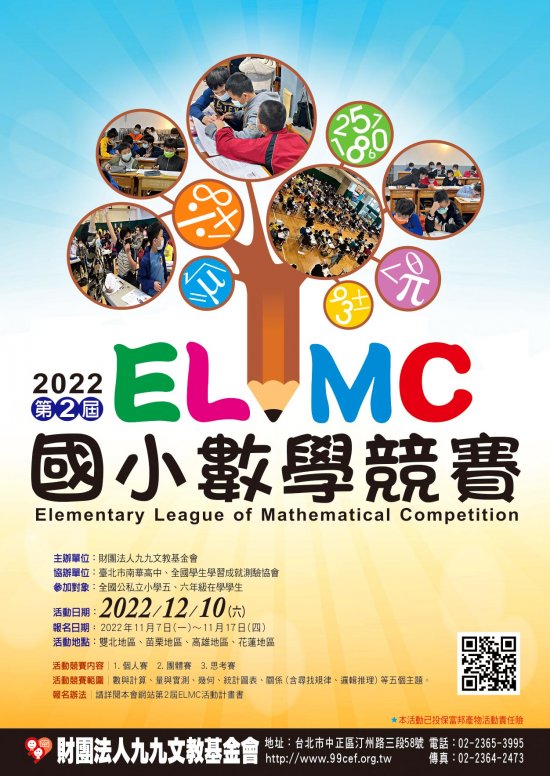 轉知財團法人九九文教基金會辦理第二屆ELMC國小數學競賽訊息