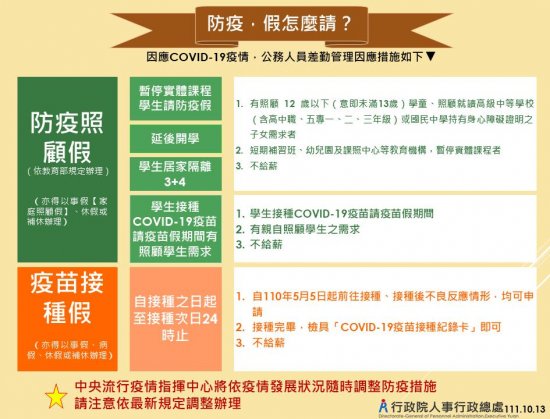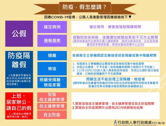 配合指揮中心前發布「邊境穩健開放,自10月13日起入境人員免除居家檢疫,改須7天自主防疫」及自主防疫規範,修正「防疫,假怎麼請?」