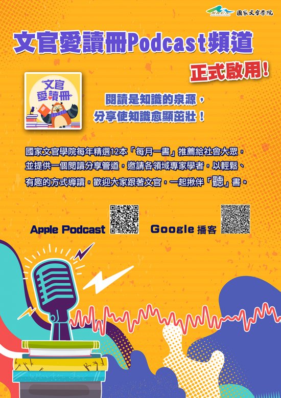 為擴大公務人員專書閱讀多元學習管道,國家文官學院成 立「文官愛讀冊」Podcast頻道,請轉知所屬同仁多加利 用,