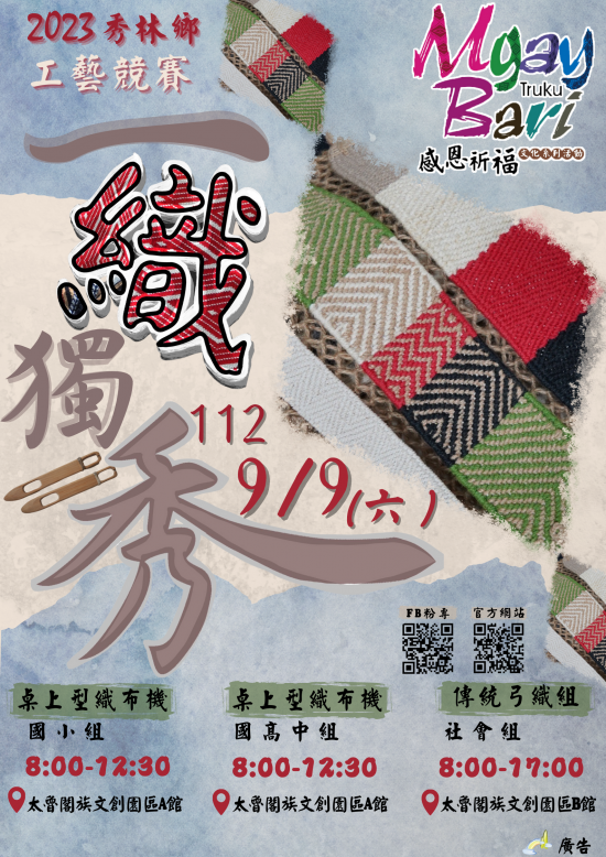 | 一、 | 依據花蓮縣秀林鄉2023 Truku Mgay Bari感恩祈福文化系列活動實施計畫【一織獨秀工藝競賽】實施計畫。 |
