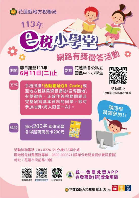 為建立正確租稅知識與普及租稅教育,即日起至本(113)年6月11日(星期二)止舉辦國中小學生「e稅小學堂」網路有獎徵答活動。