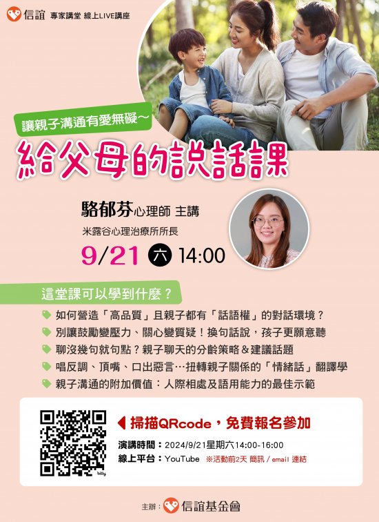 一、親子之間的溝通,不只是傳達大人的想法與期待,也要提供孩子表達的機會。如何做,能讓孩子感受被理解、被尊重?如何說,能讓孩子願意聽又不會壞了親子關係?信誼將於2024年9月21日(六)下午2:00-4:00舉辦【溝通有愛無礙~給父母的說話課】線上LIVE講座,邀請爸媽免費報名參加。