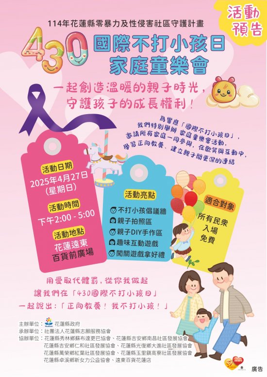 114年花蓮縣零暴力及性侵害社區守護計畫活動通知~430國際不打小孩日家庭童樂會