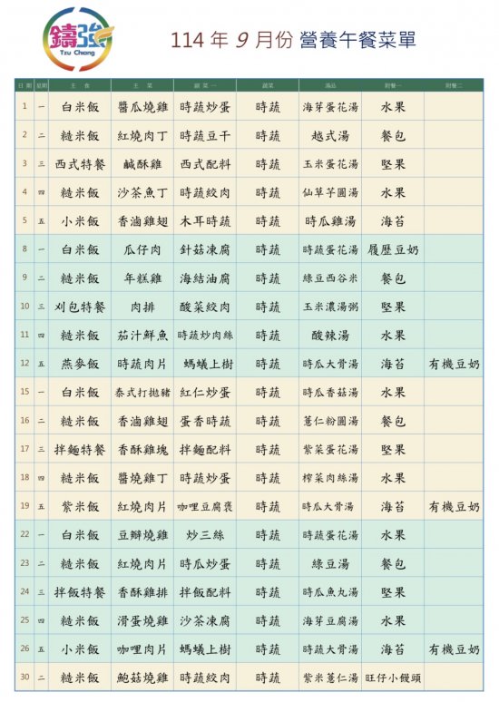 114學年度上學期 9月營養午餐菜單上菜囉~~