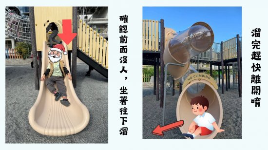 大溜滑梯區 (樓梯、繩索區請依序排隊、由下往上爬)
