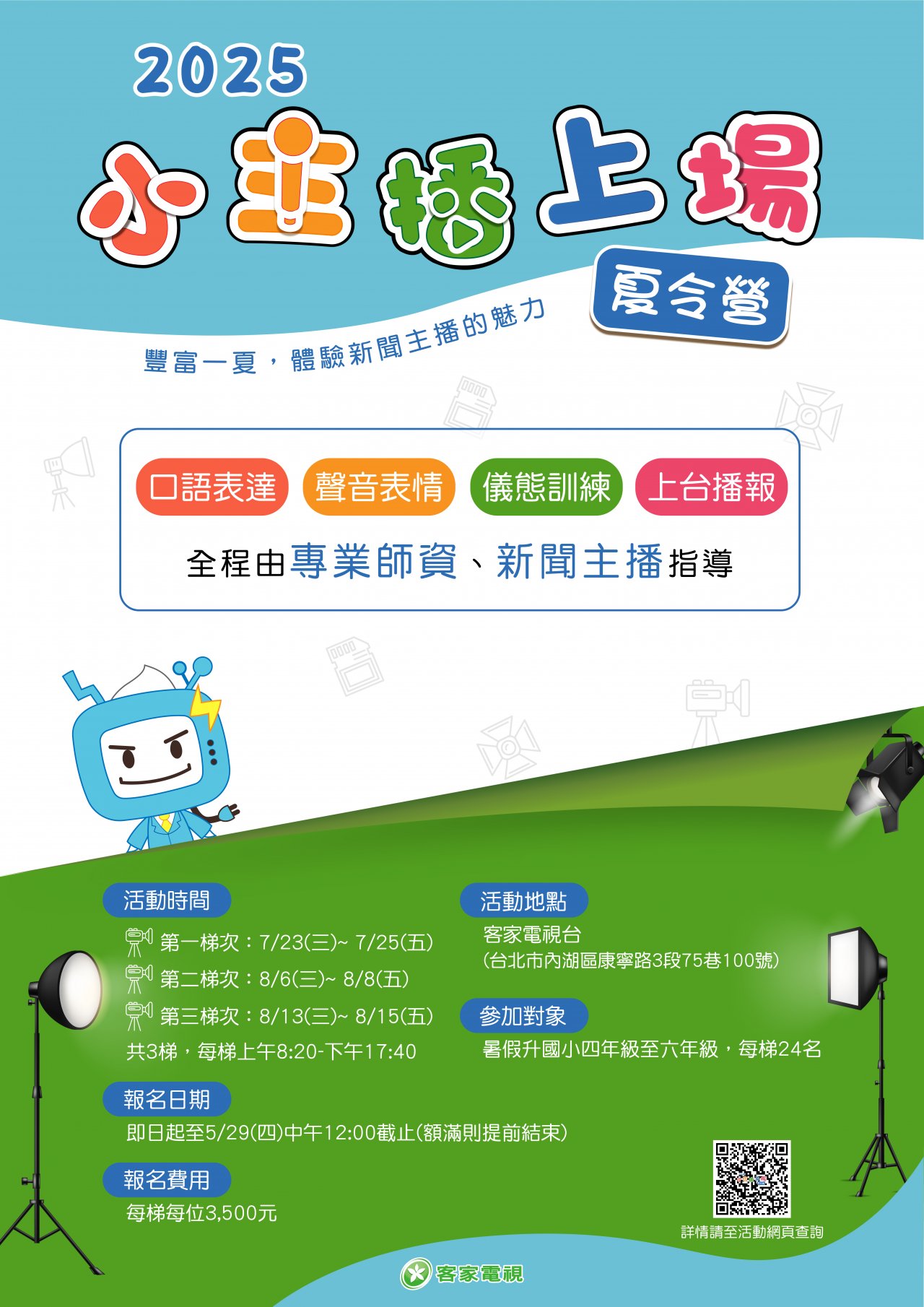 一、 為增進學童媒體素養、語言表達能力及團隊合作精神,並透過分組學習與實際演練,體驗新聞製作及主播播報技巧,本會客家電視特於暑期舉辦「2025客家電視小主播上場夏令營」,針對暑期後國小四到六年級學生設計內容,並邀請專業講師及新聞主播進行授課。