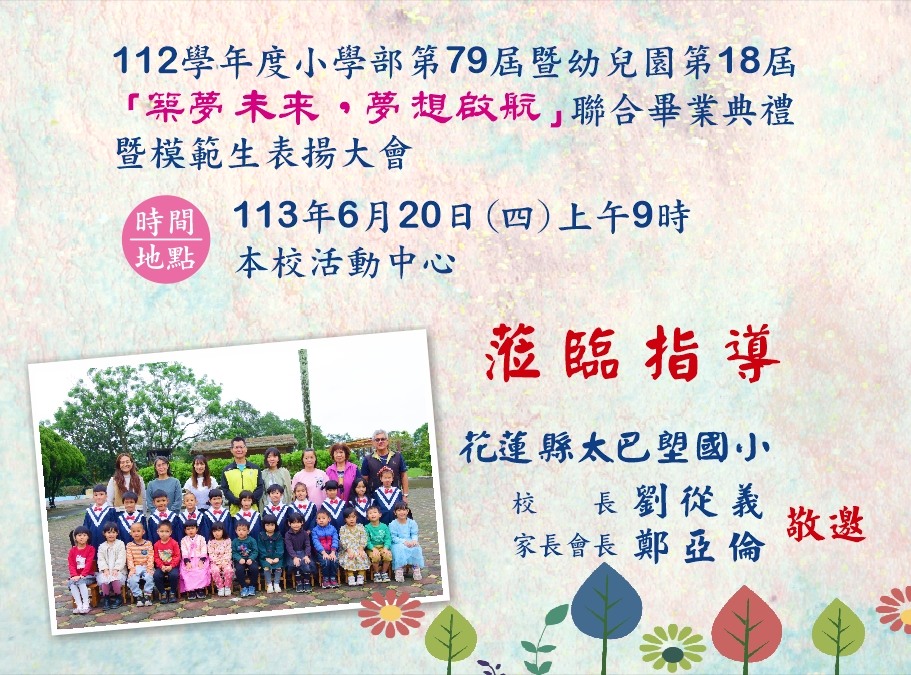 112學年太巴塱國小國小部第79屆暨幼兒園第18屆「築夢未來,夢想啟航」聯合畢業典禮暨模範生表揚大會於113年6月20日上午9時,歡迎蒞臨指導。