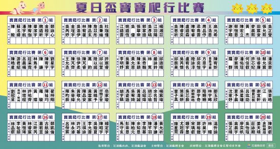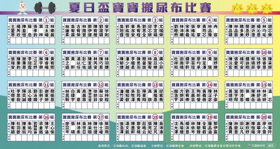 親愛的家長您好 為配合中央指示活動防疫措施進行人流管制 8/28寶寶爬行/搬尿布比賽活動報到時間如下 搬尿布第1-10組13:30報到,第11-20組14:00報到 爬行比賽第1-10組15:00報到,第11-20組15:30報到 進入會場請配合實施防疫措施,非該組人員請勿進入。 每名寶寶陪同大人限二位。 詳情分組名單如下查詢。 謝謝您的配合。